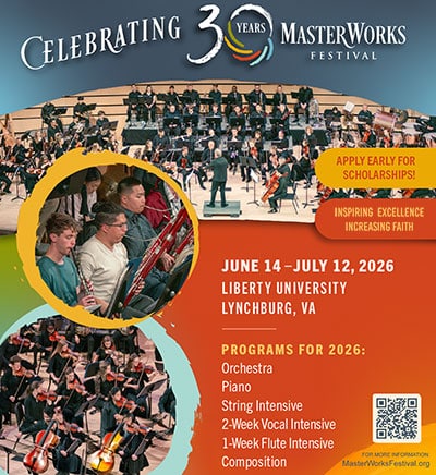 The MasterWorks Festival is an intensive, four-week festival for advanced and passionate students of the classical performing arts, ages 14-26. Together, world-class faculty and gifted students present brilliant performances in an atmosphere of dynamic Christian faith. Programs offered include: Orchestra Piano Composition, String Intensive Flute Intensive Vocal Intensive. Located at Liberty University. Scholarships available.